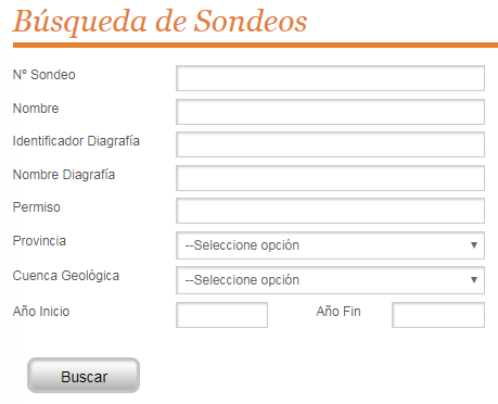 In the Well Guided Search form, it appears differents filters in which it's able to carry out a selective search: by number, name, identifier and name of the chart, license, province in which they are, geological basin, start year and end year. Once desired filters are selected you will click on "Search" button to execute the consultation.