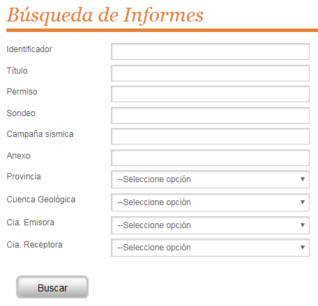In the Reports Guided Search form, it appears differents filters in which it's able to carry out a selective search by: identifier, title, licence, well and/or Seismic Survey associated, annexe, province, geological basin, issuing company and receiving company.