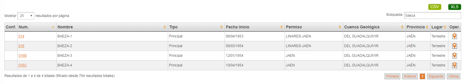At the top part of the table you can select the number of results to show per page, two buttons to export the data, one to download the data in CSV format and another for XLS, and a field to filter the search performed by any column. While at the bottom of the table there is a paging control that allows you to move quickly through the result set, and you can see the number of search results.