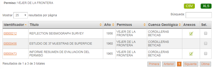 Once search is executed, if it's not empty , it will be show in a table. This table has one row for each Report and it will show identifier, title, year, associated licences, geological basin, if there are annexes and a box so you can choose it, it the user wants to make a request with this Report within.