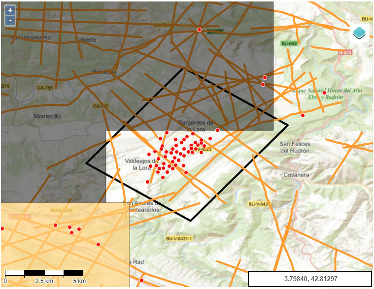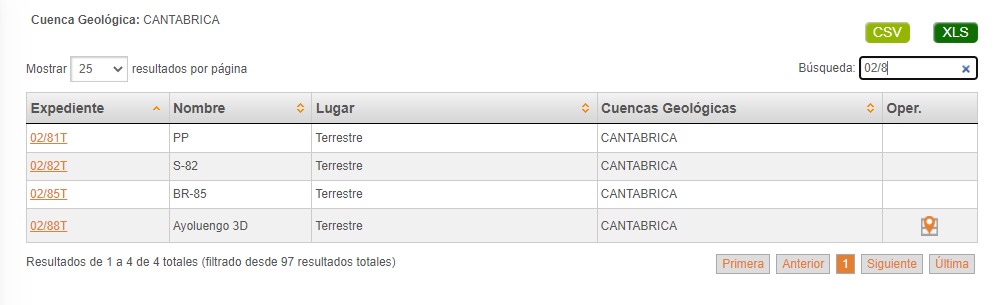 When we click on "Map", the application redirects us to the viewer in which the seismic survey appears, in the form of a thick black line, along with the rest of the wells, licences and seismic lines.