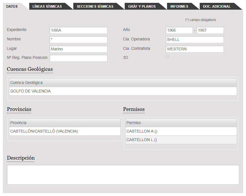 By clicking on the link in the "File" column, the information about this Survey is expanded on a new screen. The data tab shows the general information about Seismic Survey and the other tabs you can see the Seismic Lines, Seismic Sections, Graphs and Plans, Reports and Additional Documentation associated with that survey.